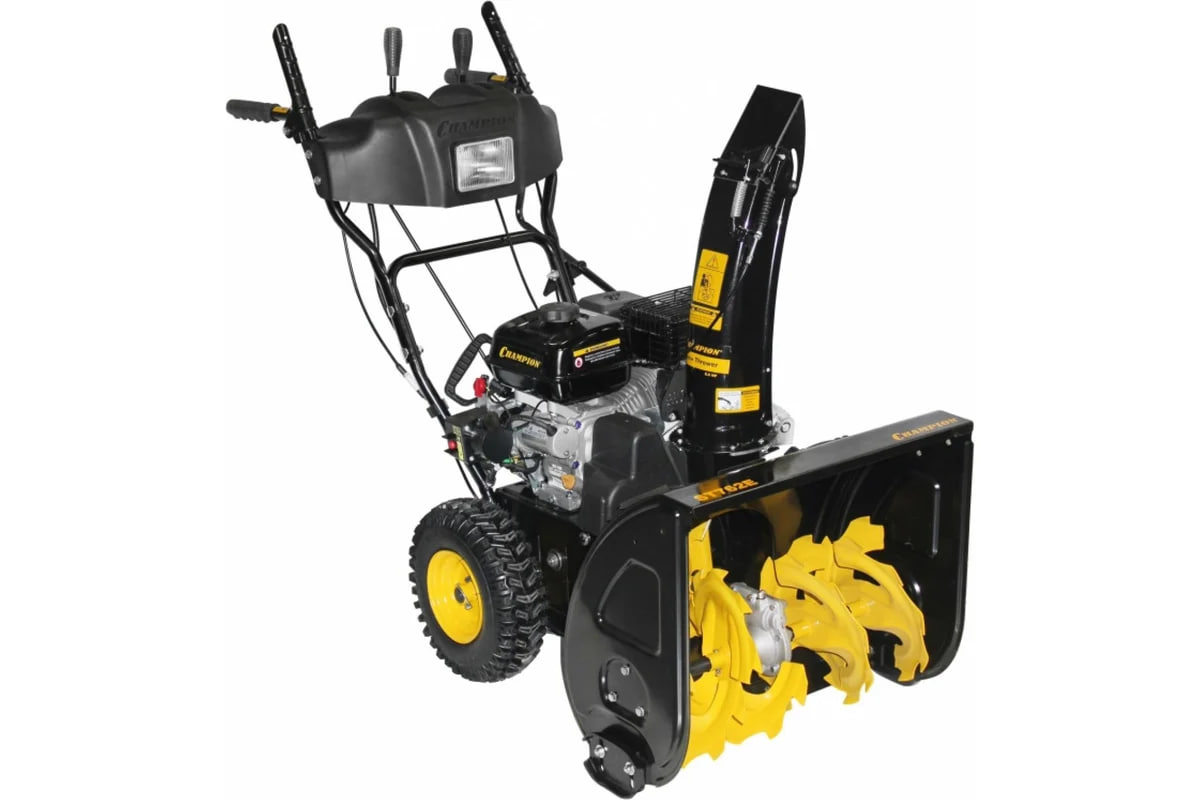 Снегоуборщик CHAMPION ST762E – это бензиновая самоходная модель, оснащенная 4-тактным двигателем мощностью 6.5 л.с. с воздушным охлаждением. Он имеет ширину захвата 62 см и зубчатый шнек, что позволяет эффективно убирать даже тяжелый слежавшийся снег. Дальность и направление выброса снега можно регулировать с помощью специального рычага. Электрический стартер обеспечивает быстрый и легкий запуск двигателя.